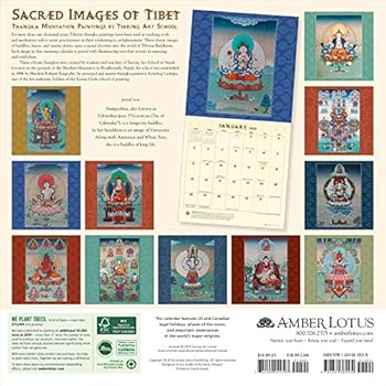 Classic images of authentic Tibetan thangka paintings open a sacred doorway into the world of Tibetan Buddhism. In the Sacred Images of Tibet wall calendar, strikingly displayed meditative images of buddhas, goddesses, and tantric figures are paired with illuminating text that reveals their meaning and symbolism. Images like these have been used for centuries to awaken and expand consciousness. 12" x 12" wall calendar (12" x 24" open). Features extraordinary paintings by students and teachers of the Tsering Art School in Nepal. A year of exquisite thangkas on your wall. The perfect art gift for those interested in Tibetan Buddhism and meditation. We Plant Trees — Amber Lotus Publishing, an independent carbon-negative US company, has planted more than three quarters of a million trees since 2008. High-quality printing on premium paper stock. Printed on paper sourced from a combination of sustainably managed forests and recycled materials. Features US and Canadian legal holidays, phases of the moon, and important observances of the world's major religions.